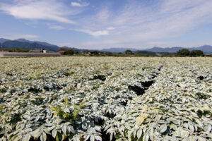 こんにゃく畑の風景 Loading小幡城下では、肥沃で水はけの良い土壌を活かして、こんにゃくの栽培が盛んに行われてきました。古い町並みをとりまくように広がるこんにゃく畑のまばゆいばかりの緑と農作業風景は、初夏から初冬の風物詩となっています。